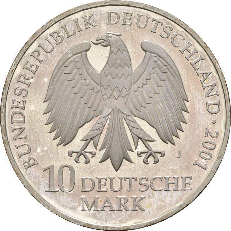 По последним данным на 5 декабря 2025 средняя стоимость серебряной монеты 10 марок 2001 года "Монастырь Святой Екатерины" с буквами J составляет 10 USD для регулярного чекана и 20 USD для монет отчеканенных по технологии PROOF.