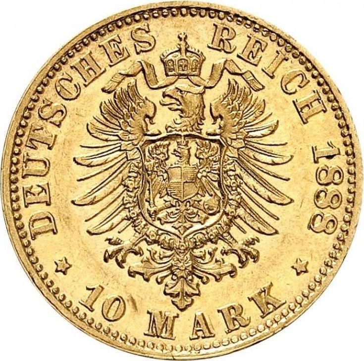 Сколько стоит золотая монета Германской империи 10 марок 1888 года D "Бавария"?