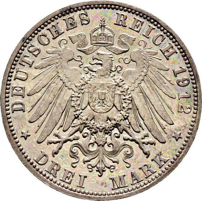 По последним данным на 5 декабря 2025 средняя стоимость серебряной монеты 3 марки 1912 года "Бавария" с буквами D составляет 55 USD для регулярного чекана и 350 USD для монет отчеканенных по технологии PROOF.
