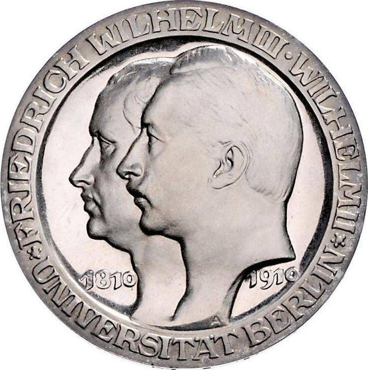 По последним данным на 6 декабря 2025 средняя стоимость серебряной монеты 3 марки 1910 года "Пруссия" с буквами A, разновидность - берлинский университет, составляет 75 USD для регулярного чекана и 470 USD для монет отчеканенных по технологии PROOF.