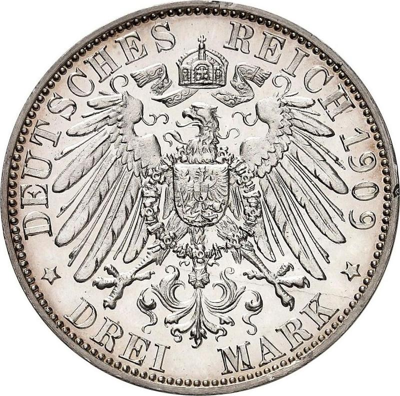 Узнайте актуальную стоимость немецкой монеты пробные 3 марки 1909 года "Рейсс-Грейц" со знаком A. Это серебряная монета периода Германской империи отчеканена на берлинском монетном дворе. Рекорд цены принадлежит лоту 6330 проданному на аукционе Fritz Rudolf Künker GmbH & Co. KG за 13000 EUR. Торги состоялись 20 июня 2012.
