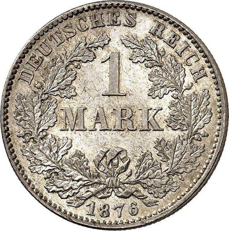 По последним данным на 6 декабря 2025 средняя стоимость серебряной монеты 1 марка 1876 года "Тип 1873-1887" с буквами H составляет 370 USD.