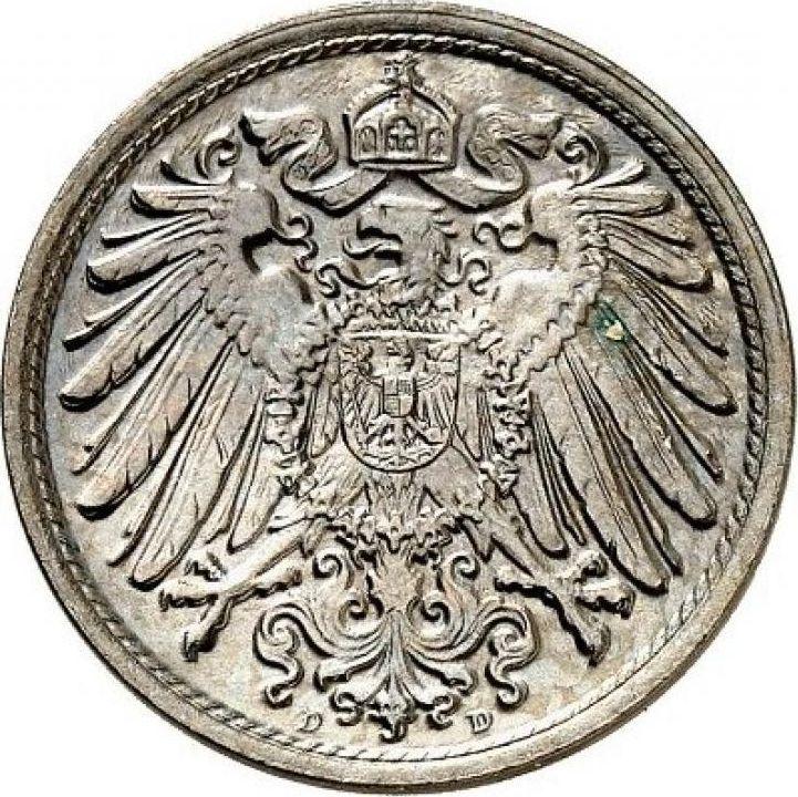 Узнайте актуальную стоимость немецкой монеты 10 пфеннигов 1899 года со знаком D. Это медно-никелевая монета периода Германской империи. Рекорд цены принадлежит лоту 4042 проданному на аукционе Heidelberger Münzhandlung Herbert Grün за 140 EUR. Торги состоялись 20 ноября 2014.