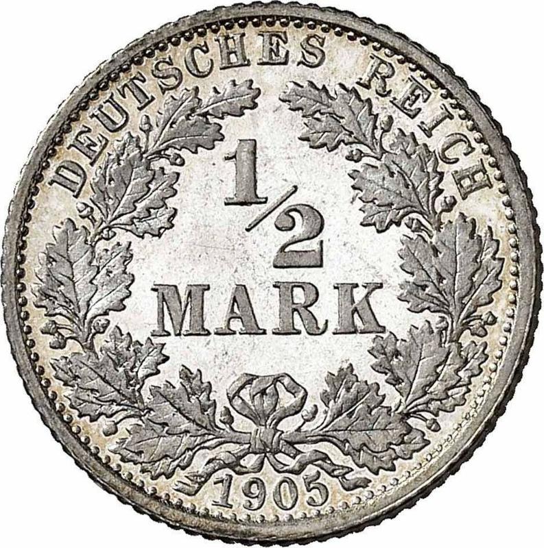 Сколько стоит серебряная монета Германской империи 1/2 марки 1905 года F?