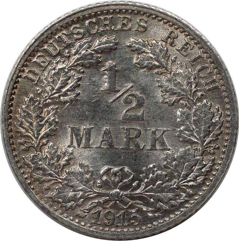 Сколько стоит серебряная монета Германской империи 1/2 марки 1915 года F?