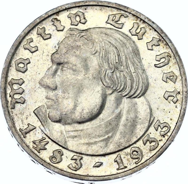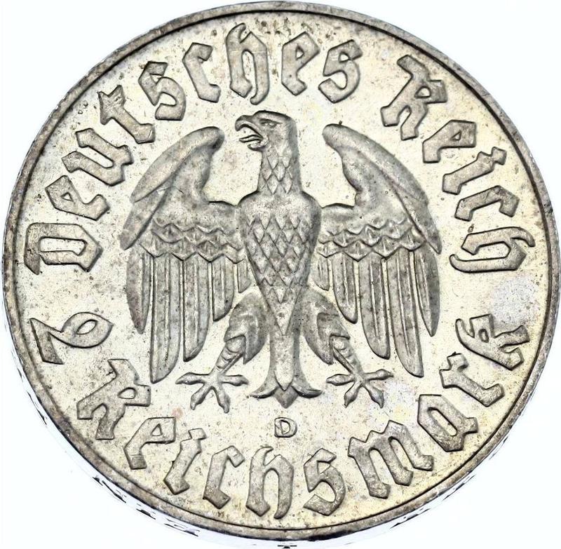 2 рейхсмарки 1933 года D "Мартин Лютер" (Германия, Третий рейх)