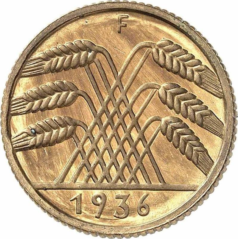 По последним данным на 6 декабря 2025 средняя стоимость бронзовой монеты 10 рейхспфеннигов 1936 года с буквами F составляет 35 USD для регулярного чекана и 350 USD для монет отчеканенных по технологии PROOF. Монета выполнена из недрагоценного металла, поэтому в плохой сохранности может иметь карайне низкую стоимость и ликвидность.