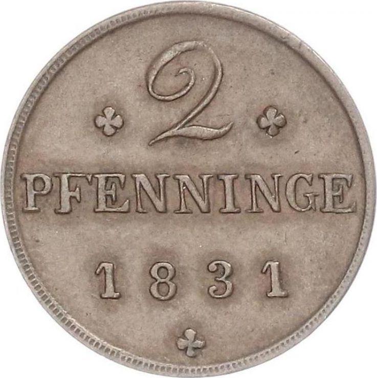 По последним данным на 5 декабря 2025 средняя стоимость медной монеты 2 пфеннига 1831 года составляет 25 USD. Монета выполнена из недрагоценного металла, поэтому в плохой сохранности может иметь карайне низкую стоимость и ликвидность.