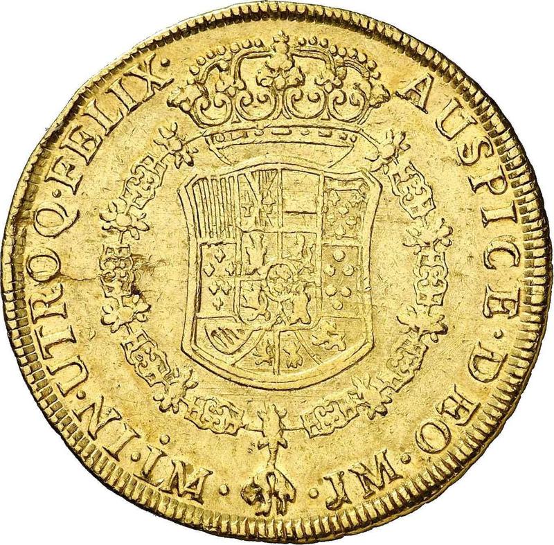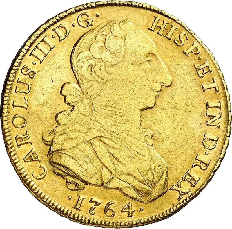 Сколько стоит золотая монета Карла III 8 эскудо 1764 года LM JM?