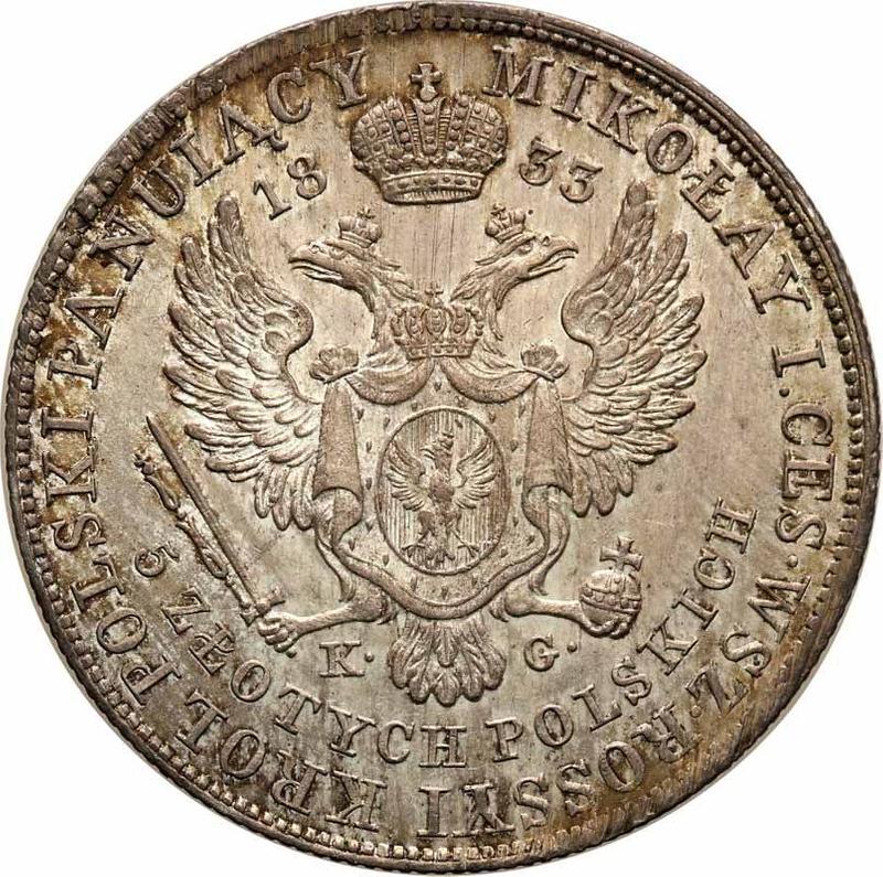 Узнайте актуальную стоимость польской монеты 5 злотых 1833 года со знаком KG. Это серебряная монета периода Царства Польского отчеканена на варшавском монетном дворе. Рекорд цены принадлежит лоту 5326 проданному на аукционе Gorny & Mosch Giessener Münzhandlung GmbH за 24000 EUR. Торги состоялись 14 октября 2010.
