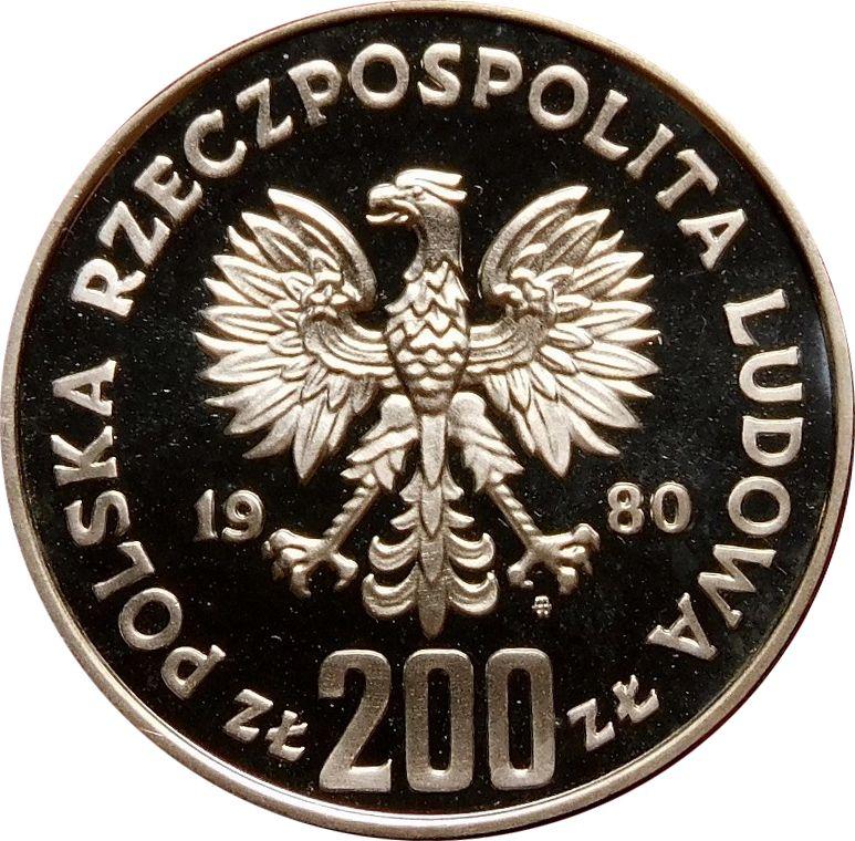 Сколько стоит серебряная монета Народной Республики пробные 200 злотых 1980 года MW "XIII зимние Олимпийские игры - Лейк-Плэсид 1980", разновидность - серебро, без факела?