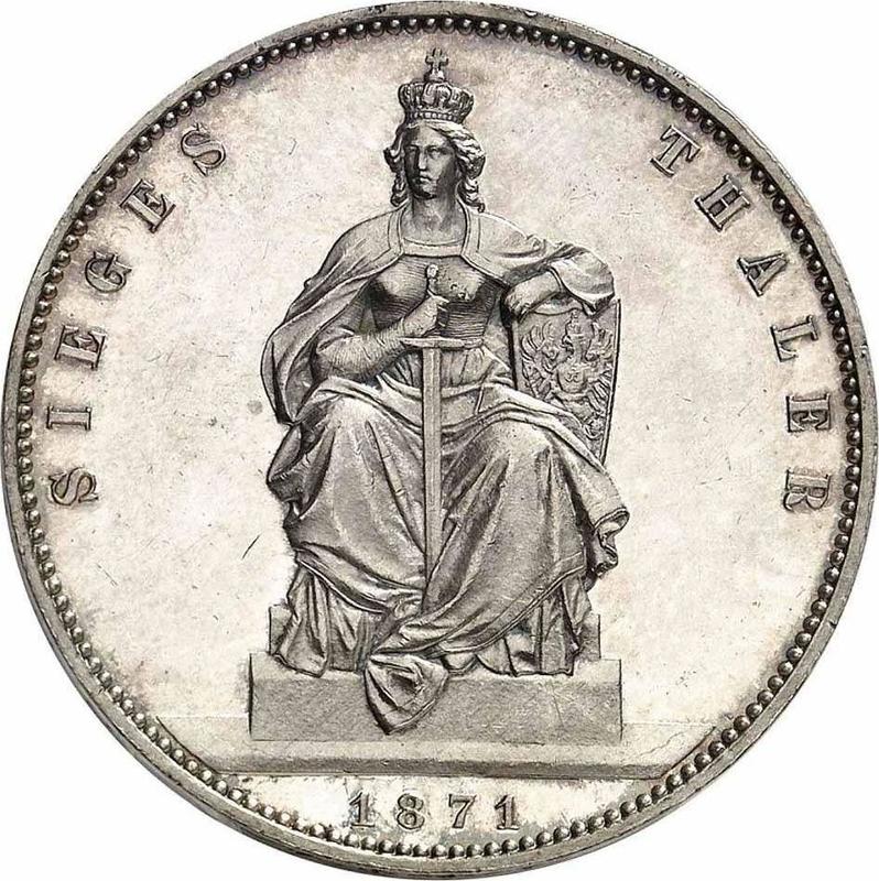 Узнайте актуальную стоимость прусской монеты талер 1871 года "Победа в войне" со знаком A. Это серебряная монета периода Вильгельма I отчеканена на Берлин монетном дворе. Рекорд цены принадлежит лоту 30318 проданному на аукционе Heritage Auctions за 2880 USD. Торги состоялись 24 апреля 2020.
