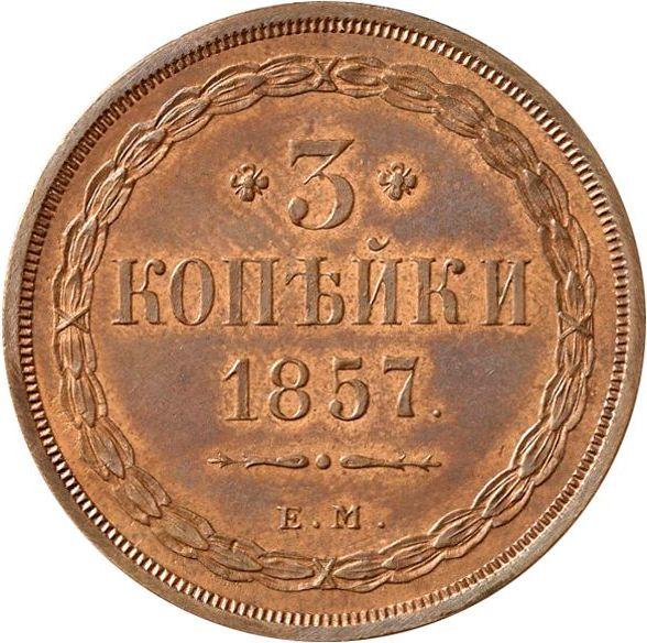 По последним данным на 5 декабря 2025 средняя стоимость медной монеты 3 копейки 1857 года с буквами ЕМ составляет 470 USD. Монета выполнена из недрагоценного металла, поэтому в плохой сохранности может иметь карайне низкую стоимость и ликвидность.