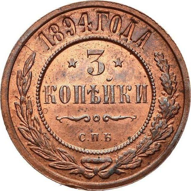 По последним данным на 5 декабря 2025 средняя стоимость медной монеты 3 копейки 1894 года с буквами СПБ составляет 470 USD для регулярного чекана и 1500 USD для монет отчеканенных по технологии PROOF. Монета выполнена из недрагоценного металла, поэтому в плохой сохранности может иметь карайне низкую стоимость и ликвидность.