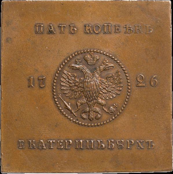 Пробные 5 копеек 1726 года ЕКАТЕРIНЬБУРХЬ "Квадратная плата". Новодел (Россия, Екатерина I)