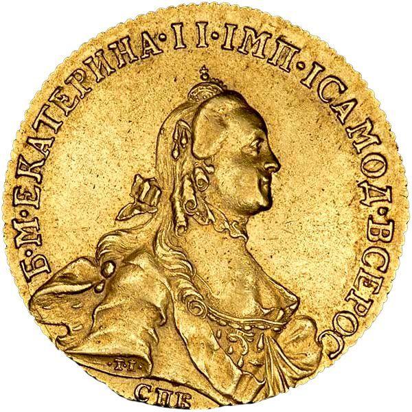 Сколько стоит золотая монета Екатерины II 10 рублей 1763 года СПБ "С шарфом"?