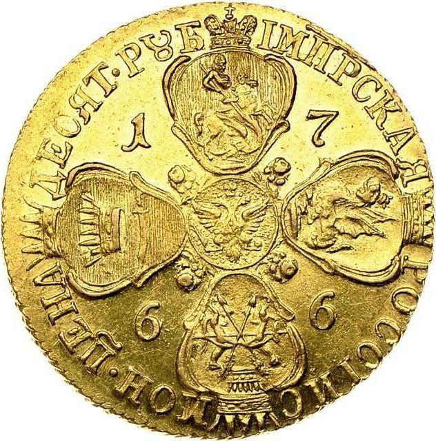 10 рублей 1766 года СПБ "Петербургский тип, без шарфа". Портрет уже (Россия, Екатерина II)