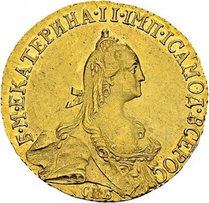 Сколько стоит золотая монета Екатерины II 5 рублей 1772 года СПБ "Петербургский тип, без шарфа"?
