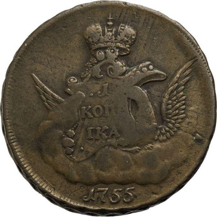 1 копейка 1755 года "Орел в облаках". Без знака монетного двора. Гуртовая надпись петербургская (Россия, Елизавета)