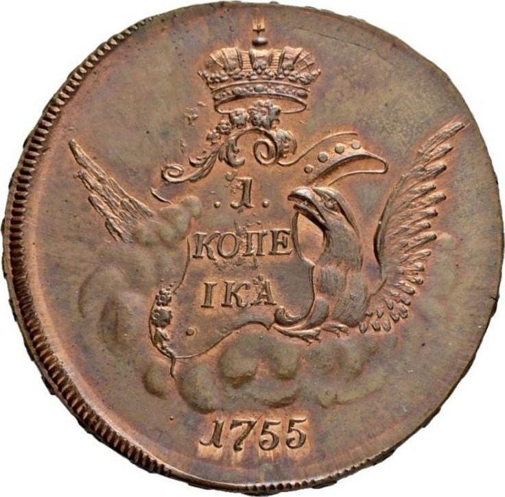 Узнайте актуальную стоимость российской монеты 1 копейка 1755 года "Орел в облаках". Без знака монетного двора. Гуртовая надпись московская. Новодел. Это медная монета периода Елизаветы Петровны отчеканена на Красном монетном дворе. Рекорд цены принадлежит лоту 30550 проданному на аукционе Heritage Auctions за 4700 USD. Торги состоялись 4 января 2015.