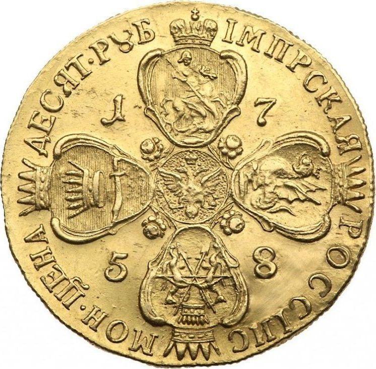 По последним данным на 5 декабря 2025 средняя стоимость золотой монеты 10 рублей 1758 года "Портрет работы Б. Скотта" с буквами СПБ составляет 66000 USD. В монете содержится 15,1947 гр чистого золота, поэтому ниже 2081,4 USD продавать монету не рекомендуем, даже если она в плохой сохранности и не представляет коллекционного интереса.