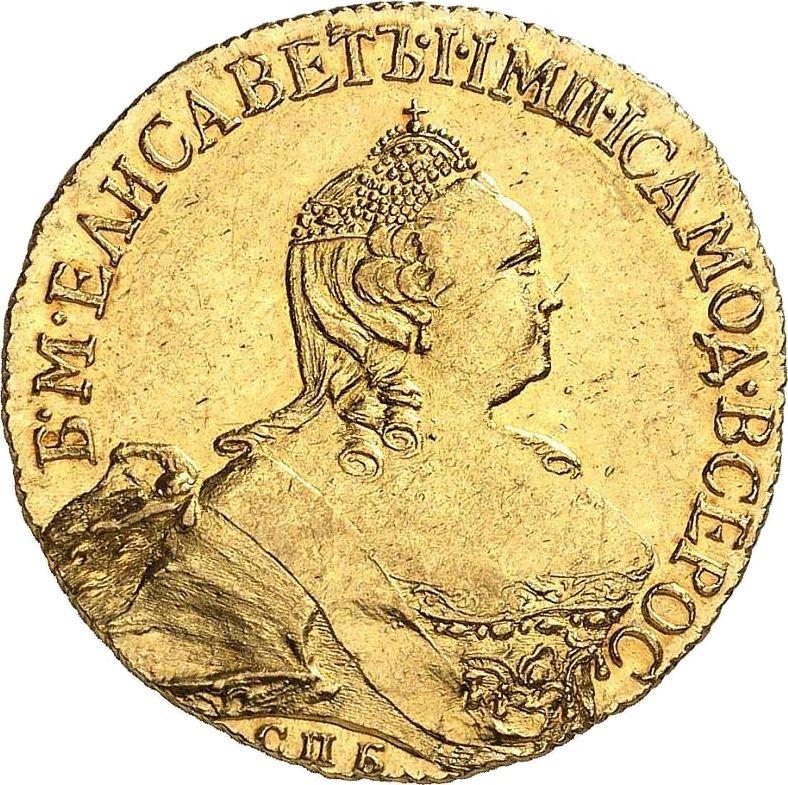 Сколько стоит золотая монета Елизаветы Петровны 5 рублей 1759 года СПБ?