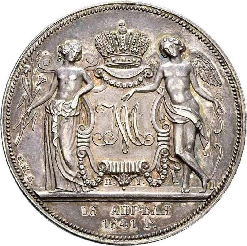 Узнайте актуальную стоимость российской монеты 1 рубль 1841 года "В память бракосочетания наследника престола" со знаком СПБ НI. "РЕЗАЛЪ ГУБЕ". Новодел. Это серебряная монета периода Николая I отчеканена на Санкт-Петербургском монетном дворе. Рекорд цены принадлежит лоту 713 проданному на аукционе Olivier Chaponnière & Hess-Divo AG за 19000 CHF. Торги состоялись 23 мая 2011.