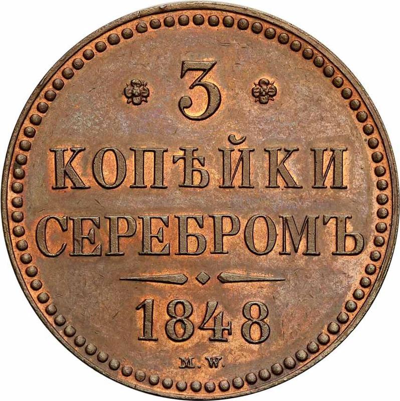 По последним данным на 5 декабря 2025 средняя стоимость медной монеты 3 копейки 1848 года "Варшавский монетный двор" с буквами MW составляет 7100 USD для регулярного чекана и 10000 USD для монет отчеканенных по технологии PROOF. Монета выполнена из недрагоценного металла, поэтому в плохой сохранности может иметь карайне низкую стоимость и ликвидность.