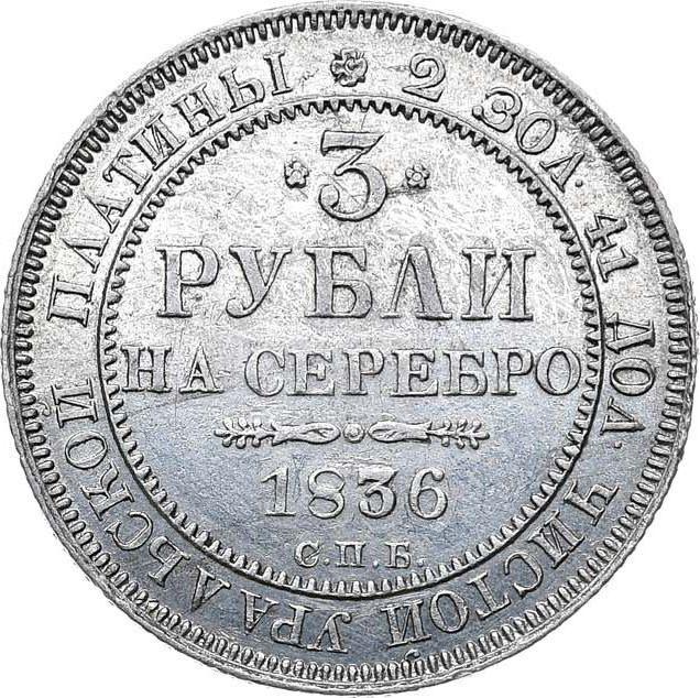 По последним данным на 5 декабря 2025 средняя стоимость платиновой монеты 3 рубля 1836 года с буквами СПБ составляет 2500 USD для регулярного чекана и 16000 USD для монет отчеканенных по технологии PROOF. В монете содержится 9,842 гр чистой платины, поэтому ниже 527 USD продавать монету не рекомендуем, даже если она в плохой сохранности и не представляет коллекционного интереса.