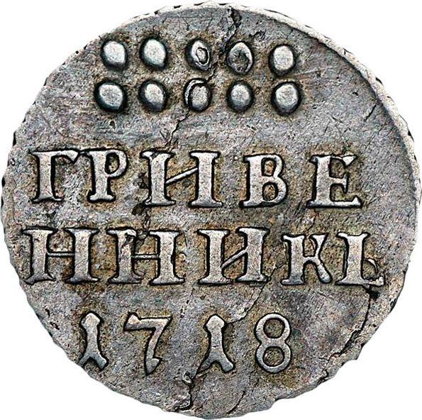 Гривенник 1718 года. Без инициалов медальера (Россия, Петр I)