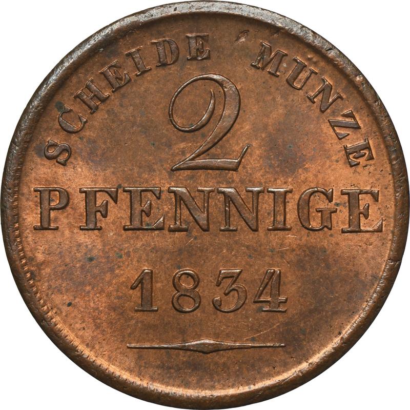 По последним данным на 5 декабря 2025 средняя стоимость медной монеты 2 пфеннига 1834 года составляет 200 USD. Монета выполнена из недрагоценного металла, поэтому в плохой сохранности может иметь карайне низкую стоимость и ликвидность.