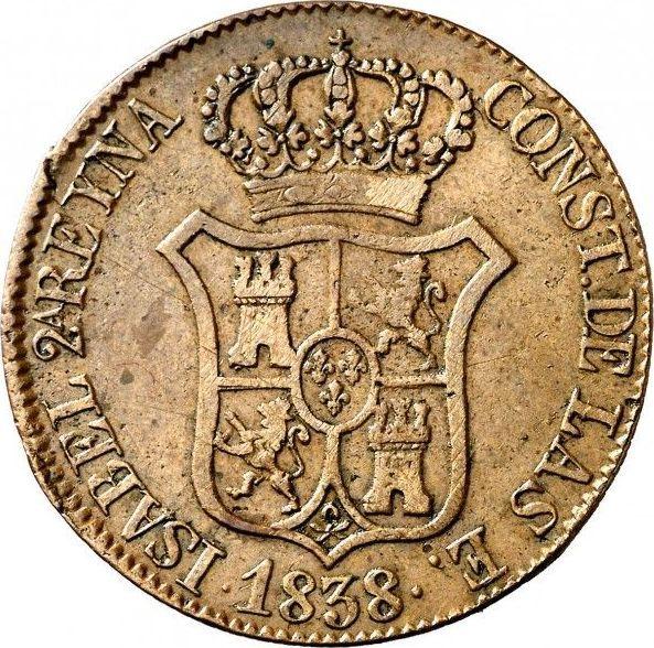 Сколько стоит медная монета Изабеллы II 6 куарто 1838 года "Каталония", разновидность - надпись "6 CURA"?