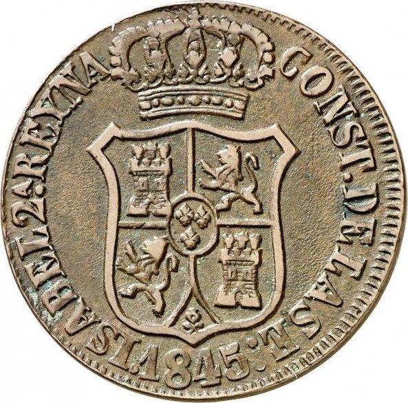 Узнайте актуальную стоимость испанской монеты 6 куарто 1845 года "Каталония". Цветы с 7 лепестками. Это медная монета периода Изабеллы II. Рекорд цены принадлежит лоту 970 проданному на аукционе Aureo & Calicó, S.L. за 185 EUR. Торги состоялись 29 октября 2015.