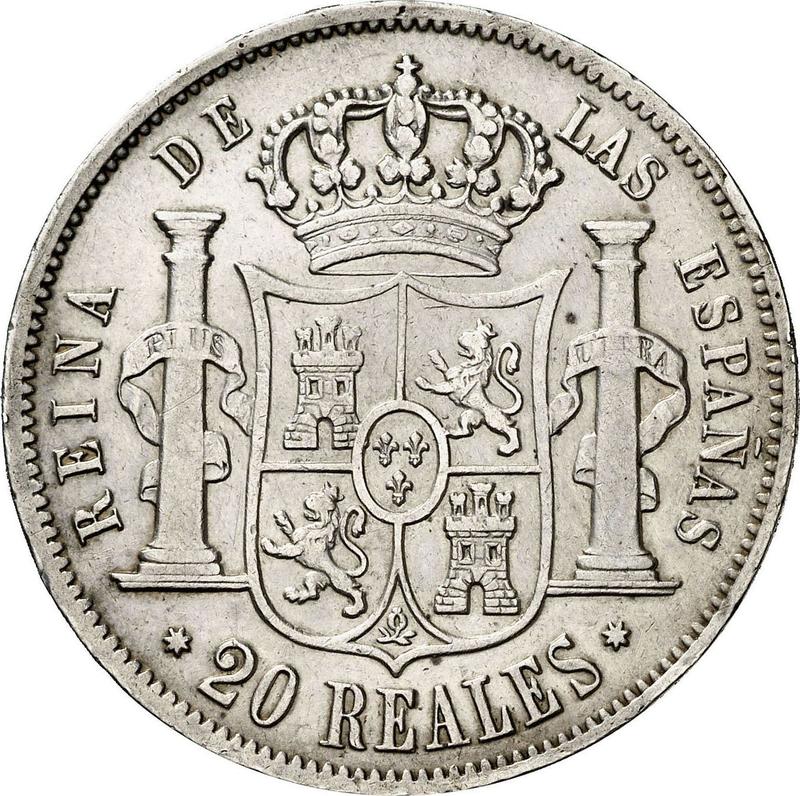 Узнайте актуальную стоимость испанской монеты 20 реалов 1854 года. Семиконечные звёзды. Это серебряная монета периода Изабеллы II. Рекорд цены принадлежит лоту 501 проданному на аукционе Aureo & Calicó, S.L. за 500 EUR. Торги состоялись 28 апреля 2011.