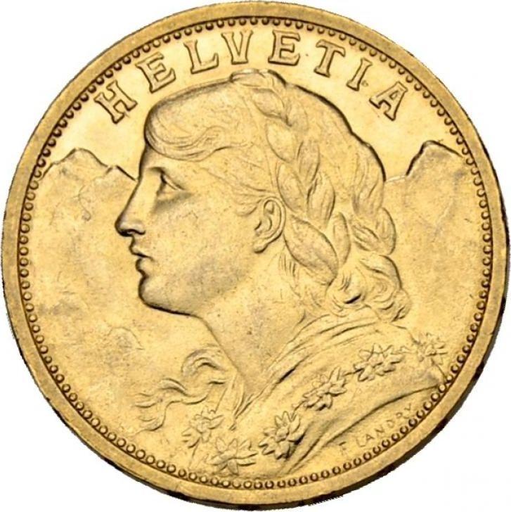 Сколько стоит золотая монета Конфедерации 20 франков 1909 года B "Вренели"?