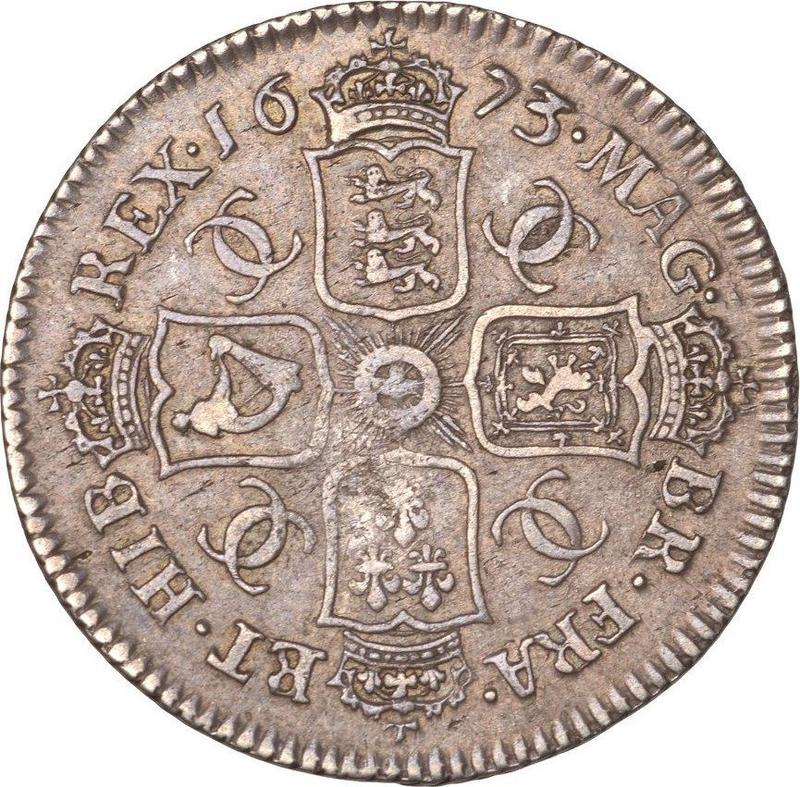 1 шиллинг 1673 года "Второй тип" (Великобритания, Карл II)