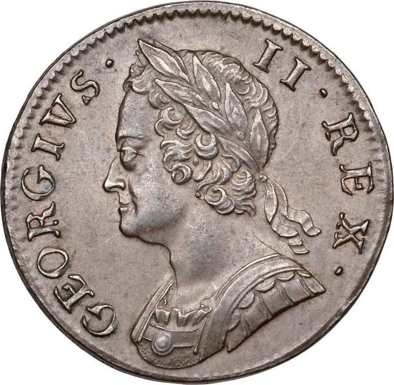Сколько стоит медная монета Георга II 1/2 пенни 1754 года "Портрет в старости"?