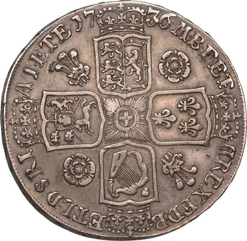 Сколько стоит серебряная монета Георга II 1 крона 1736 года "Портрет в молодом возрасте"?