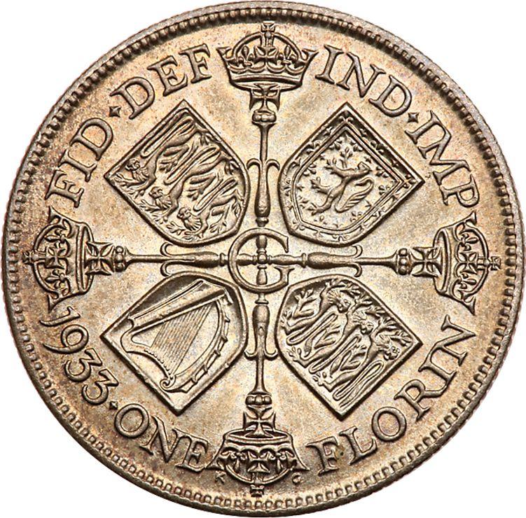Узнайте актуальную стоимость британской монеты флорин (2 шиллинга) 1933 года. Это серебряная монета периода Георга V. Рекорд цены принадлежит лоту 24283 проданному на аукционе Heritage Auctions за 1495 USD. Торги состоялись 2 января 2011.